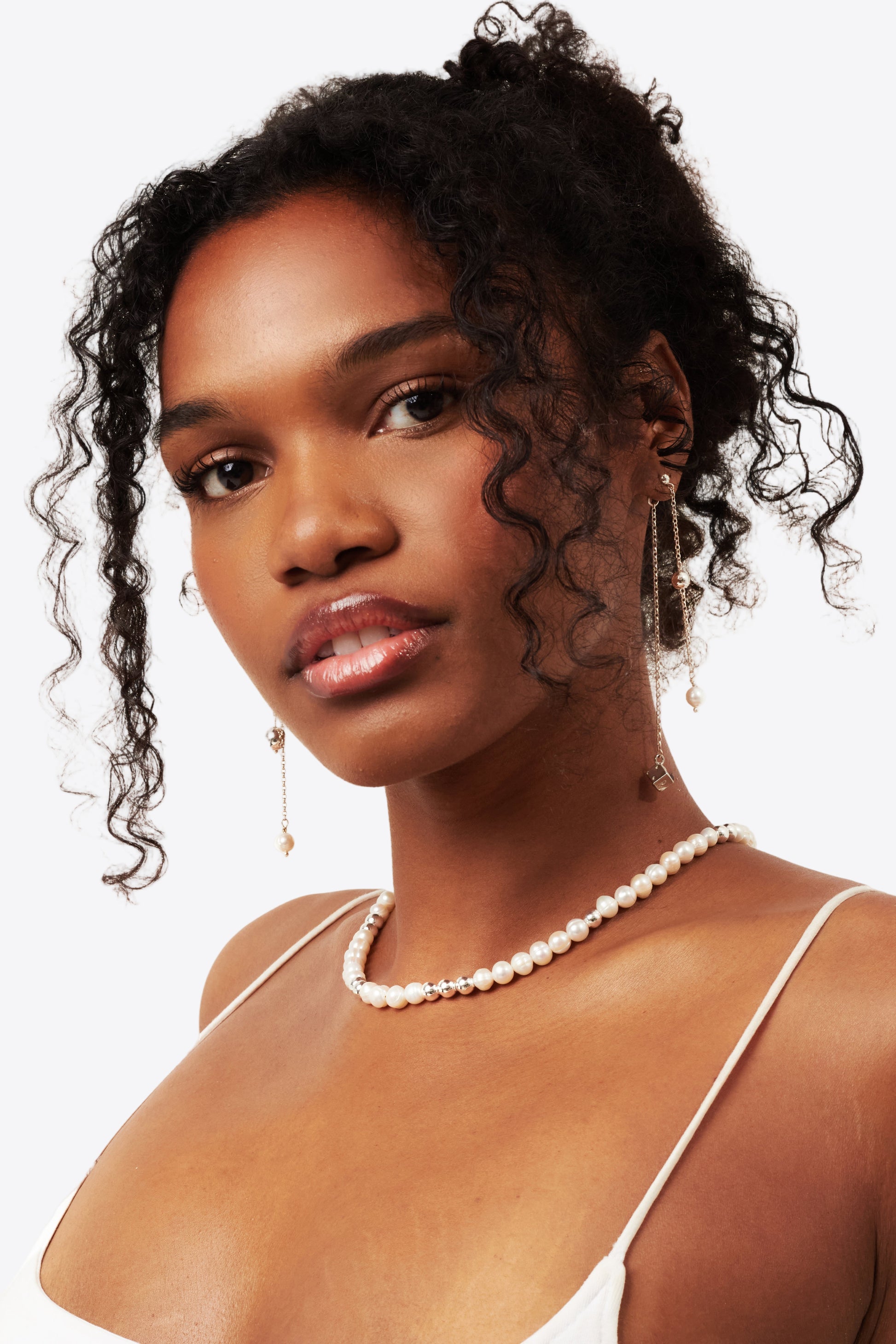The JOGO Necklace is hand-strung with natural freshwater pearls and silver-plated hematites, known for their grounding and balancing properties. Finished with sterling silver clasp and a silver-plated dice charm at the end of the extension chain, it adds a playful, eye-catching detail.
